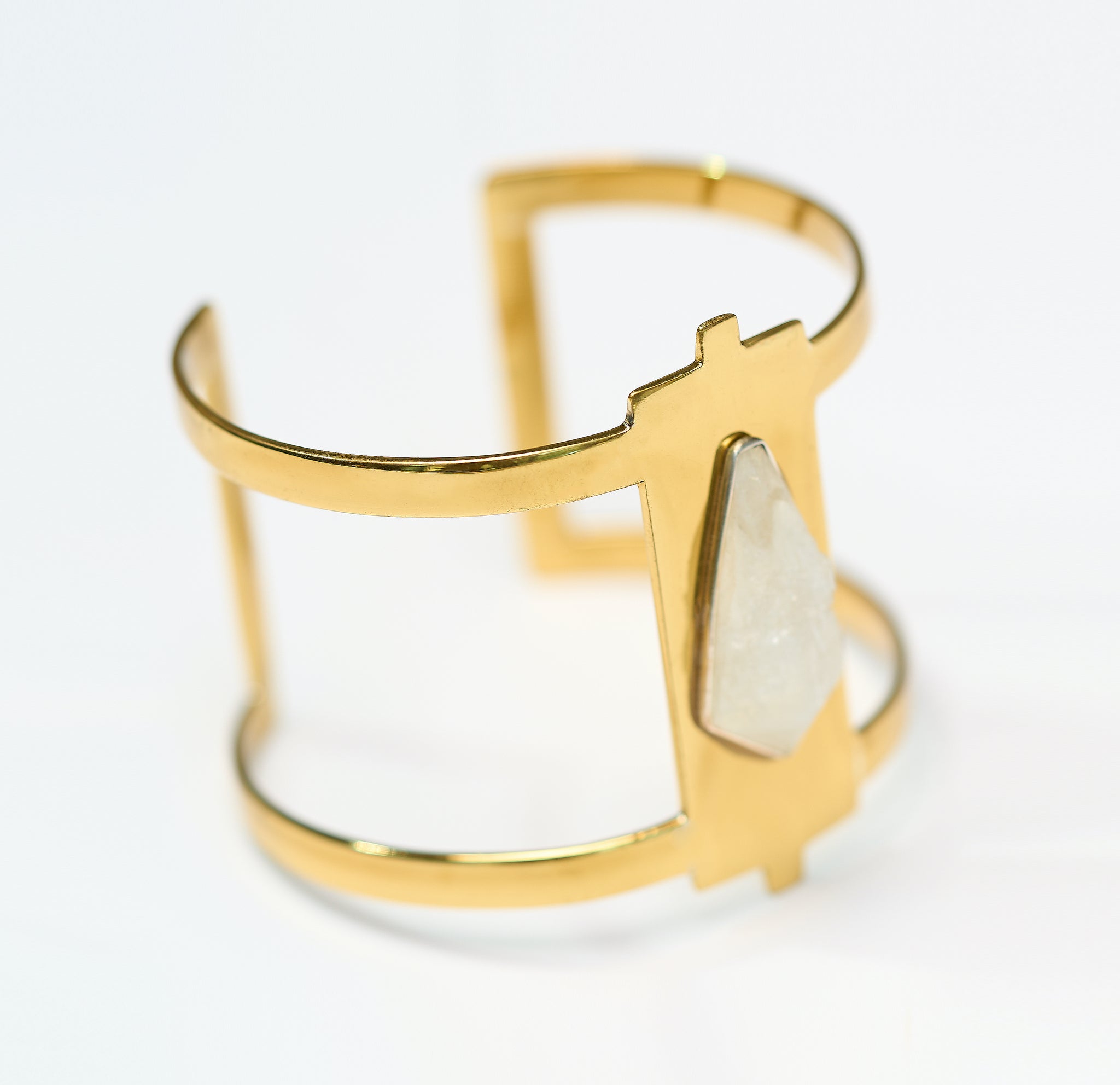 This one of a kind cuff, a style with ancient associations of power and empowerment, is a captivating blend of strength and allure. Crafted from sterling silver and brass, plated in 18k gold, and set with a hand-cut crystal this piece is more than just an accessory.