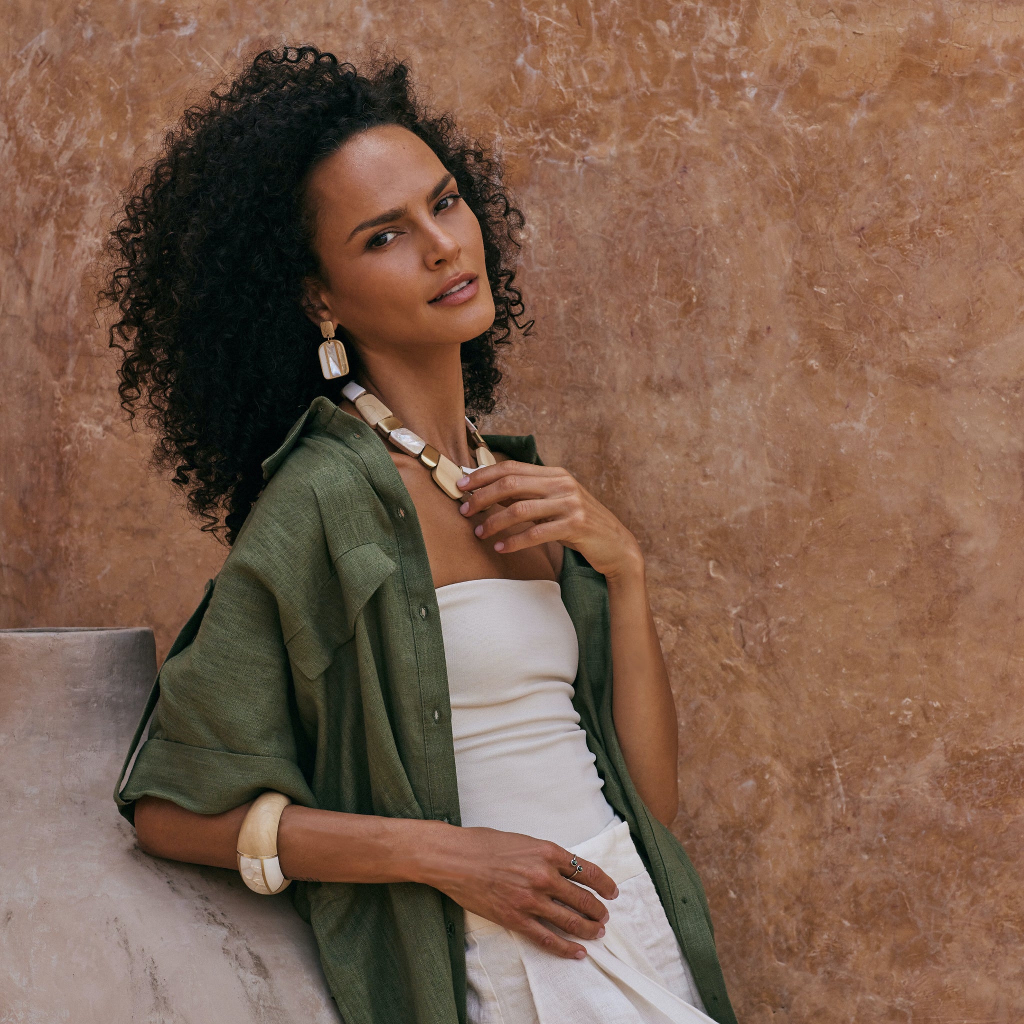Wear the Mārga Cuff with confidence. This statement hand-carved wooden bangle beautifully contrasts the smooth textures of wood and Mother of Pearl with the striking gleam of brass and the exquisite iridescence of upcycled abalone shell.