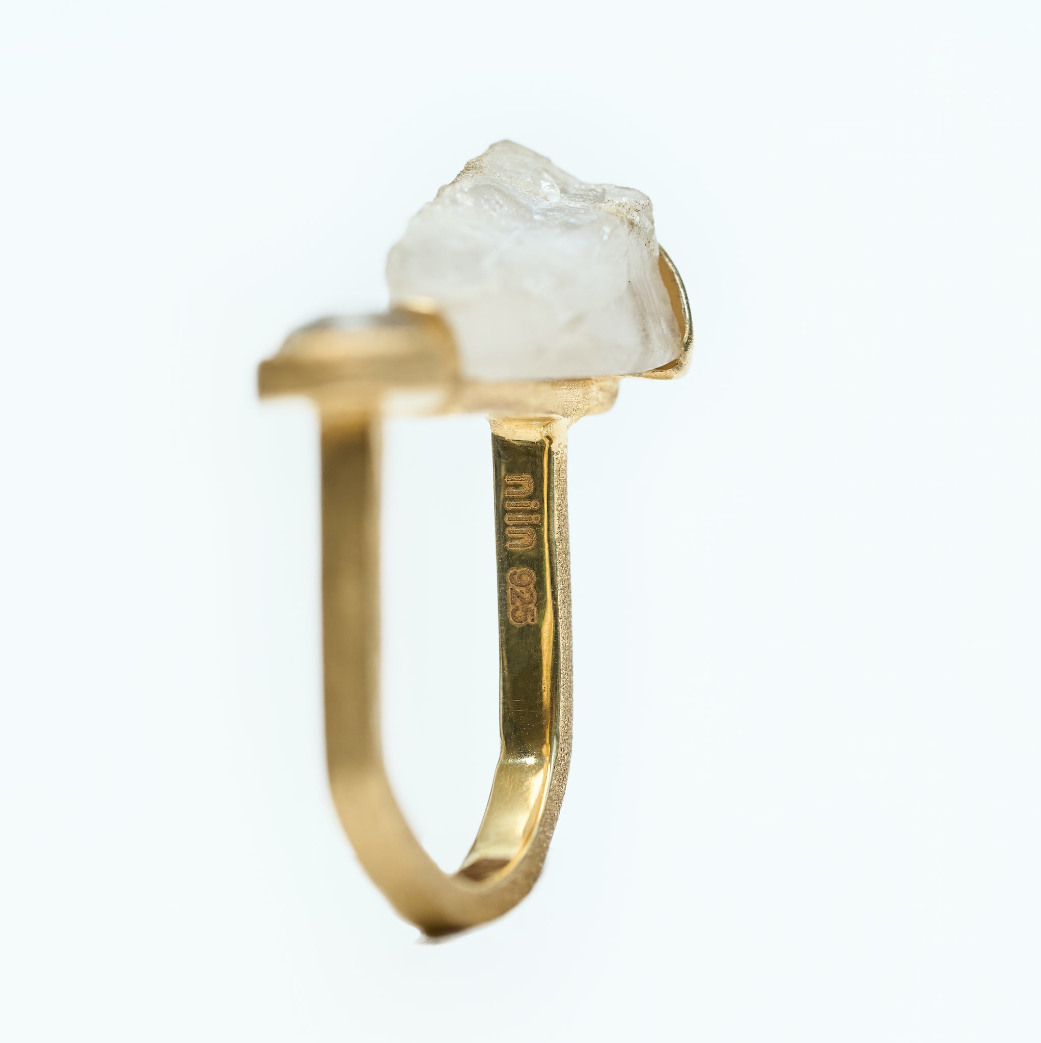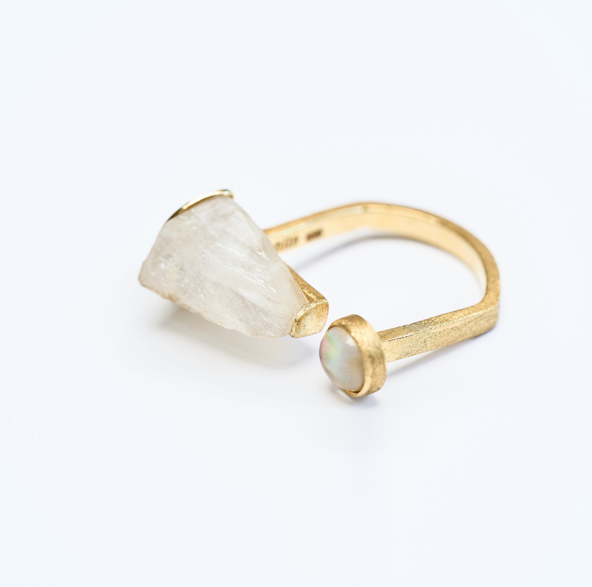 This unique cocktail ring perfectly encapsulates the MĀRGA Collection, delicately balancing a shard of rock crystal with mother of pearl set in brushed 18k vermeil.