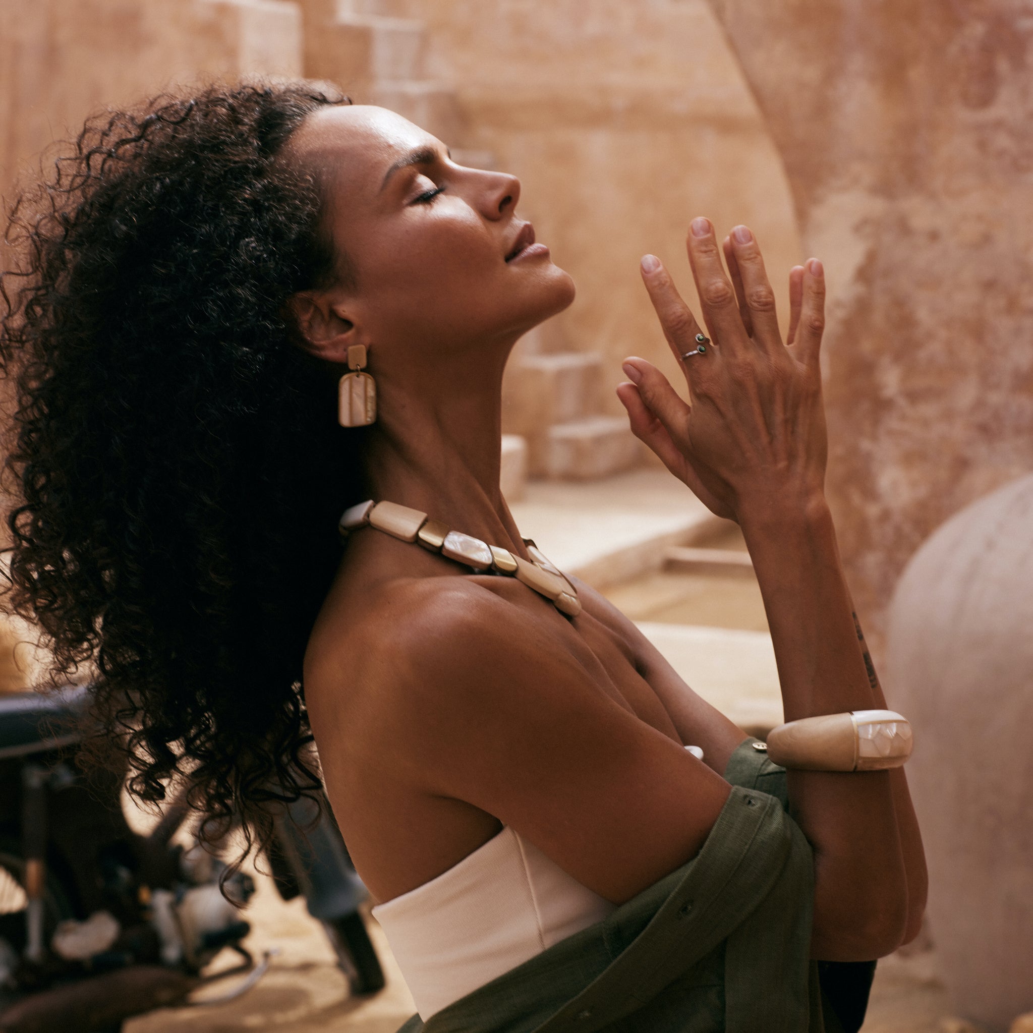 Shimmering Mother of Pearl and upcycled Abalone are set into grounding white wood, creating light but stylish and calming accessories